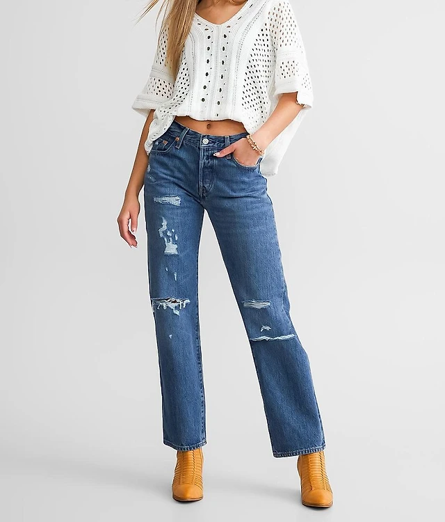 Low-Rise Distressed Medium Wash Bootcut Jeans