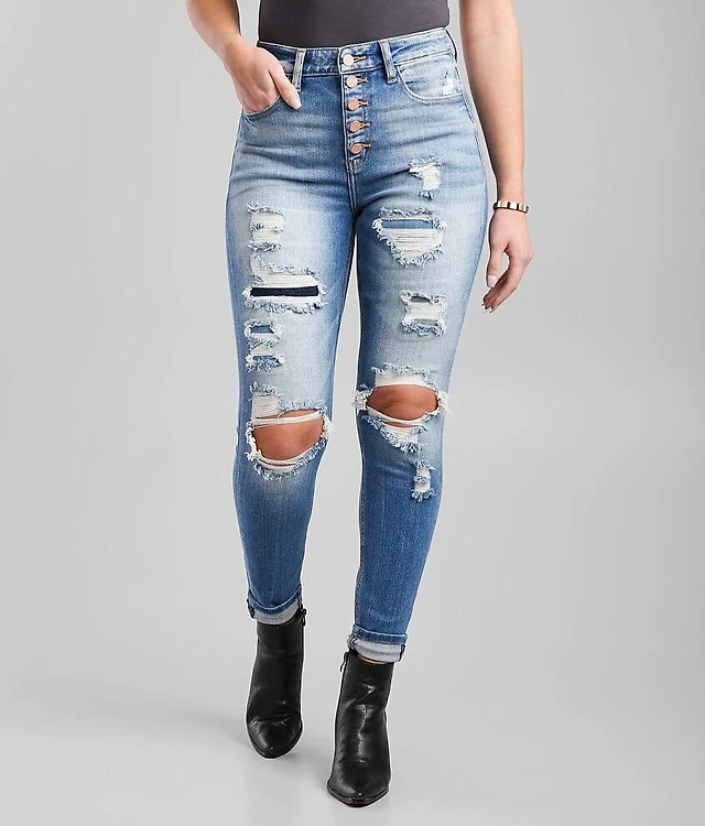 High Waisted Dark Wash Ripped Cropped Skinny Jeans