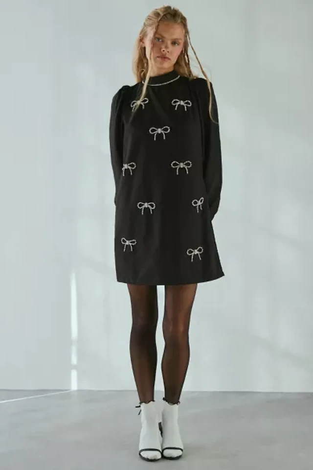 Women's Embellished Long Flare Sleeve Mesh A-Line Dress