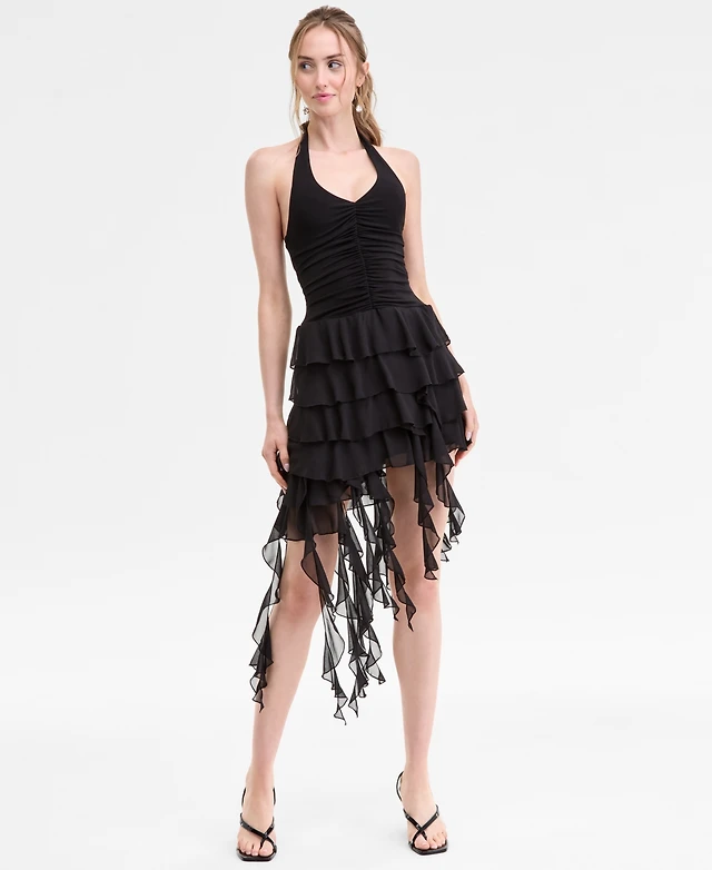 Emerald Sundae Juniors' Asymmetric Ruffled Halter Bodycon Dress