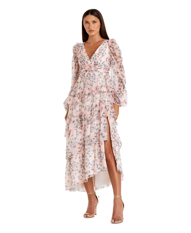 Mac Duggal Women's Elegant Puff Sleeve Floral Midi Dress with A-Line Silhouette and Side Pockets