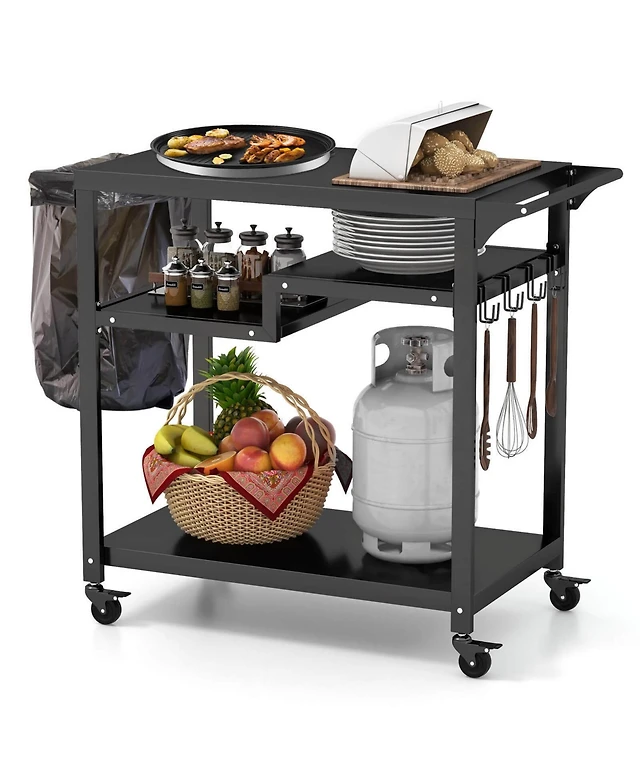 Skonyon Rolling Grill Cart 3-Shelf Bbq Cart with Hooks and Side Handle-Black