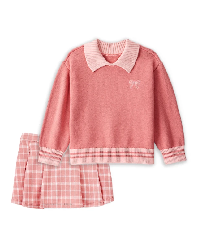 Toddler Girl 2-Piece Bow Sweater & Plaid Knit Skort Set - Pink