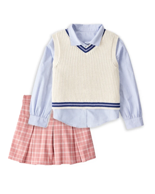 Girls 3-Piece Button-Front Shirt, Sweater Vest & Plaid Skort Set - Multi