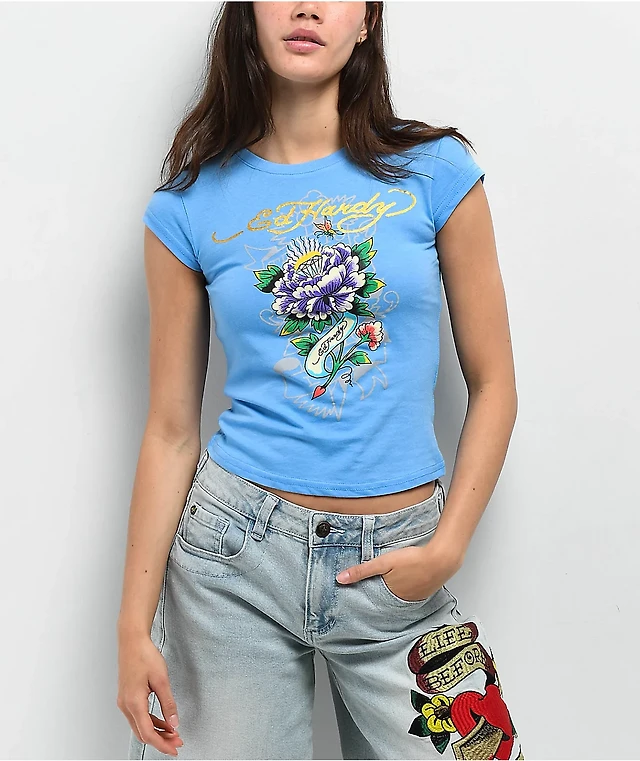 Ed Hardy Diamond Flower Power Blue Cap Sleeve Crop T-Shirt