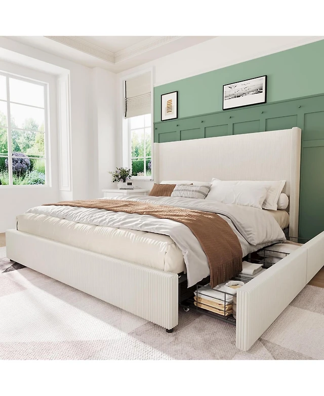 Gaomon King Size Bed Frame With Storage Drawers Corduroy Upholstered Platform With Wingback Tufted Headboard Footboard