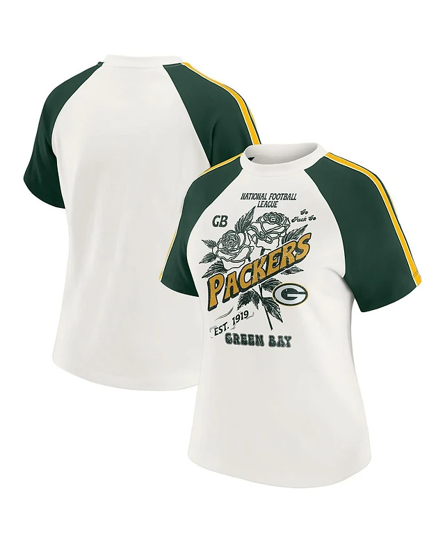 Wear by Erin Andrews Women's White Green Bay Packers Sleeve Stripe Distressed Raglan T-Shirt