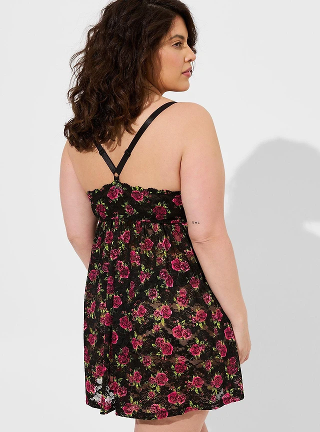 Stella Plus Galloon Lace and Mesh Soft Cup Babydoll with Connected Bodysuit Inside Flyaway Front