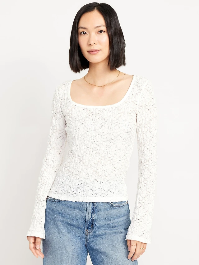 Long Sleeve Floral Lace & Pleats V-Neck Peasant Top