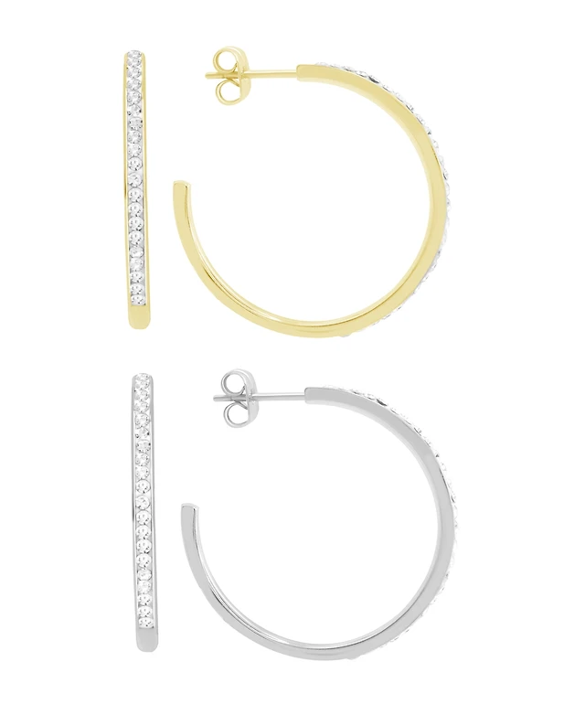 And Now This High Polished Clear Crystal Duo C Hoop Earring Pair, Gold Plate and Silver Plate