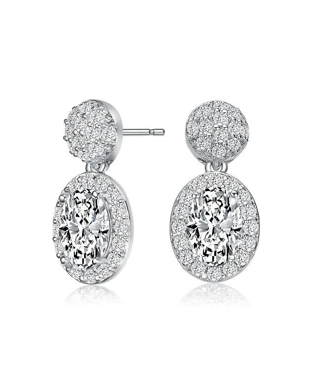Sterling Silver with White Gold Plated Clear Oval and Round Cubic Zirconia Halo with Cluster Post Drop Earrings