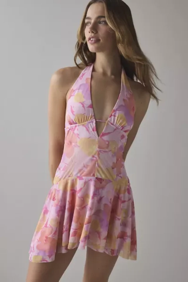 UO Lauren Mesh Plunge V-Neck Halter Mini Dress