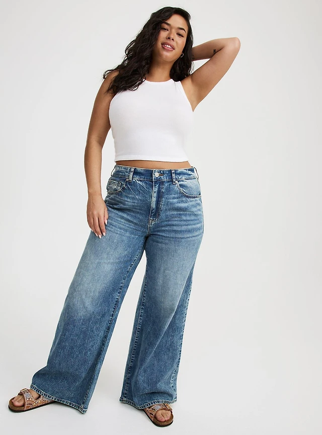 High Waisted Medium Wash Pleated Relaxed Wide Leg Jeans