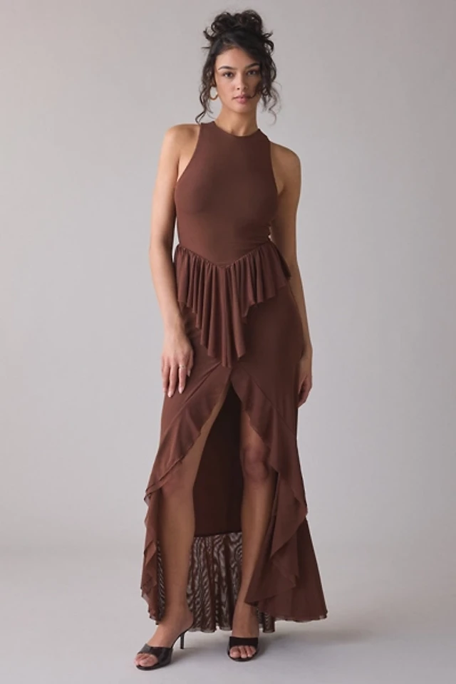 AFRM Bovina Asymmetrical Ruffle Mesh Maxi Dress