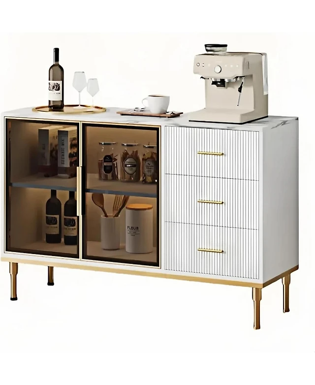 White Wood Buffet Cabinet with Carved Doors & Storage