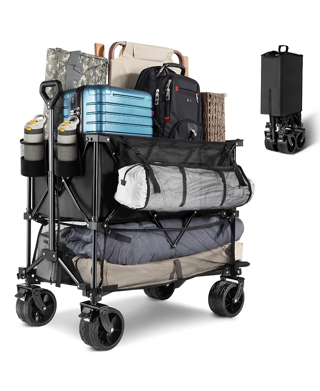 450lbs Heavy Duty Double Decker Collapsible Folding Wagon Cart with 360° Wheels, and Extra Storage