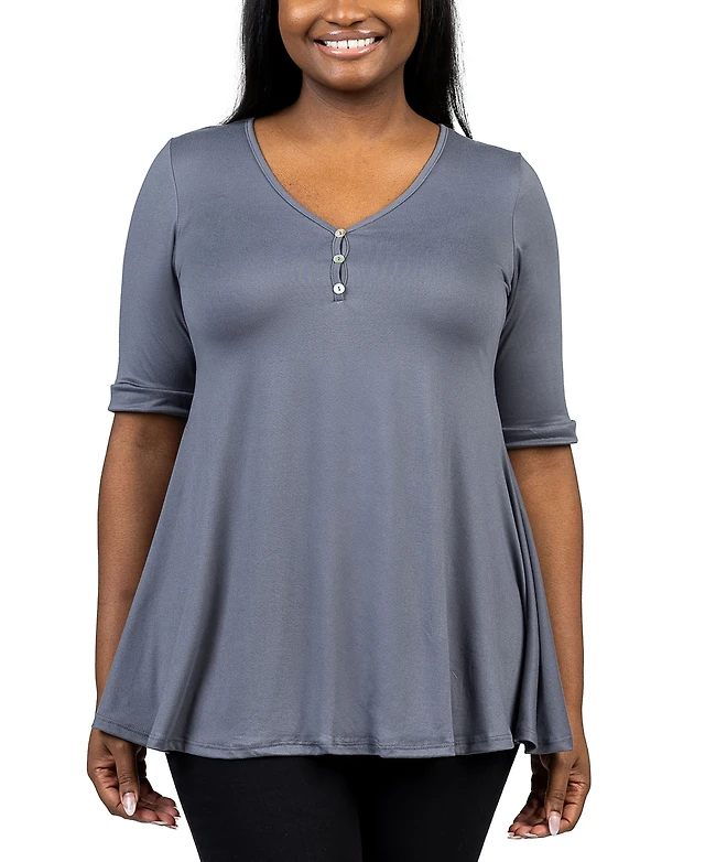24seven Comfort Apparel Plus Size Print Elbow Sleeve V-Neck Henley Tunic Top