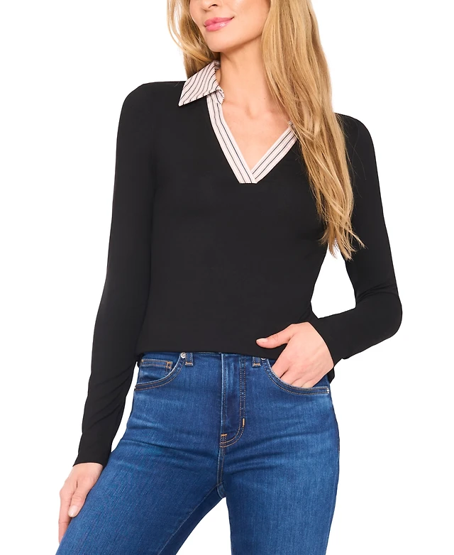 CeCe Women's Rhinestone Embellished Long Sleeve Collared Top