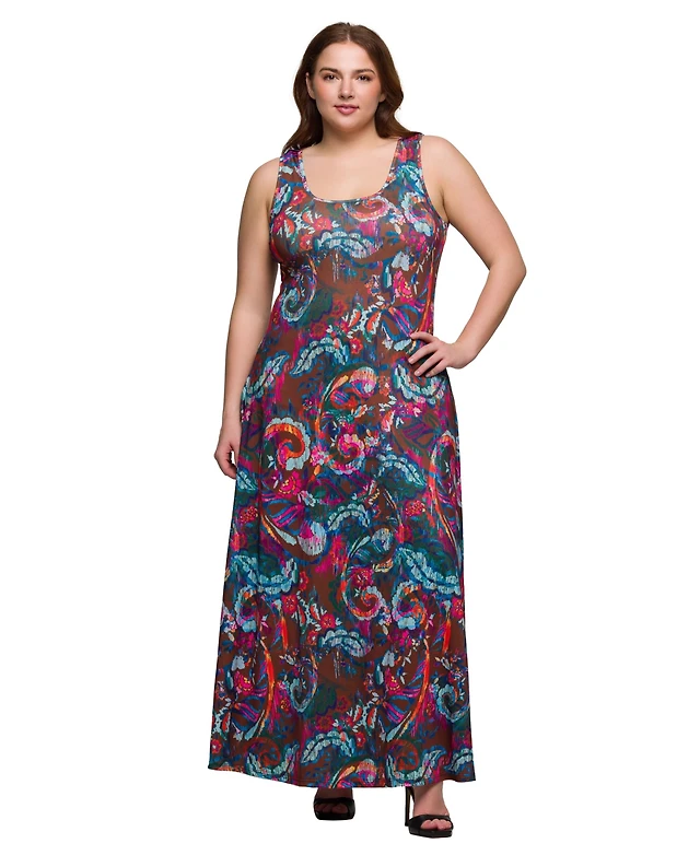 24seven Comfort Apparel Women's Pink and Brown Print Scoop Neck A Line Sleeveless Maxi Dress