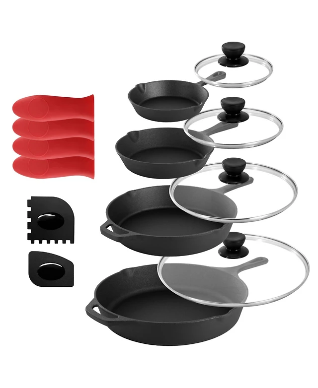 MegaChef Mini Cast Iron 4 Piece Square Pan with Wood Tray