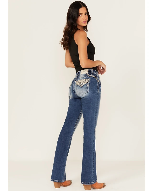 Miss Me Women's Medium Wash Mid Rise Embroidered 32" Bootcut Stretch Denim Jeans