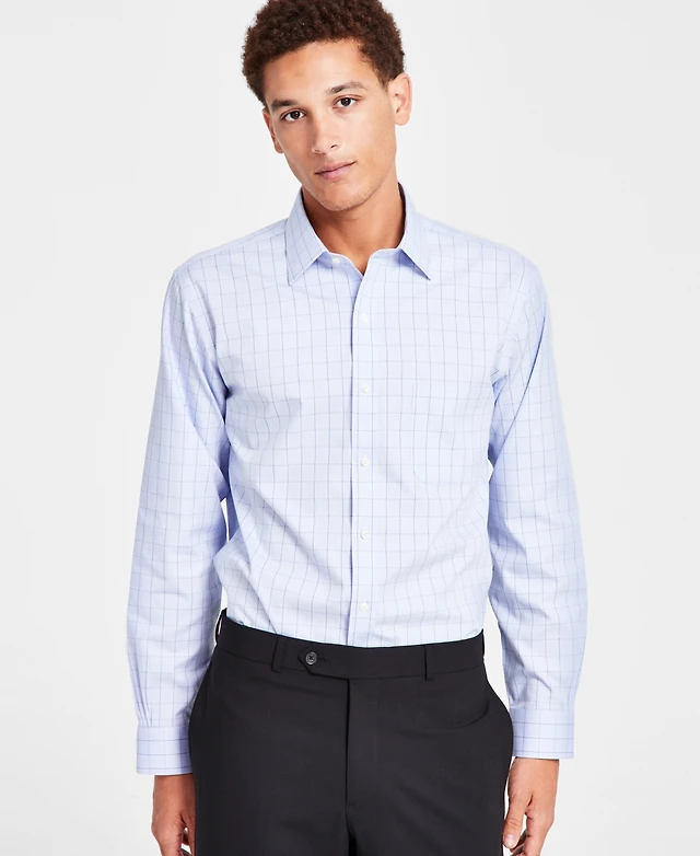 Men's Regular Fit Non-Iron Plaid-Print Performance Stretch Dress Shirt