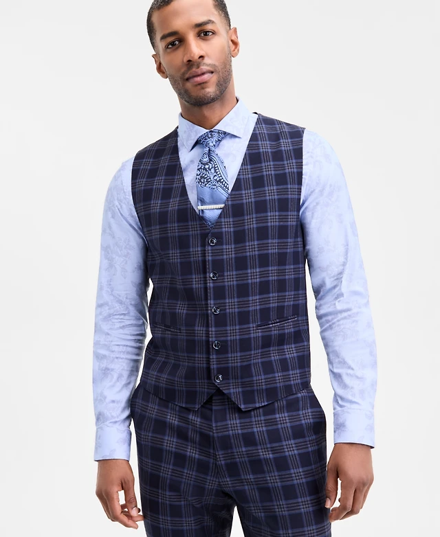 Tayion Collection Men's Classic-Fit Blue Plaid Suit Separate Vest