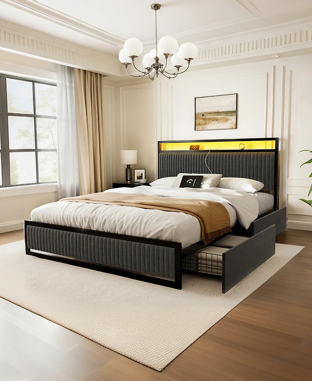Gaomon Bed Framewith 4 Storage Drawers Headboard Linen Upholstered Platform Bed Frame With Wooden Slats Support Button Tufted Design No Box Spring Needed