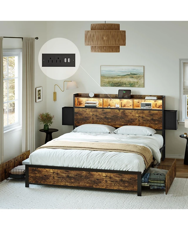Gouun Queen Bed Frame with 2-Tier Storage Headboard and Charging Station-Queen Size