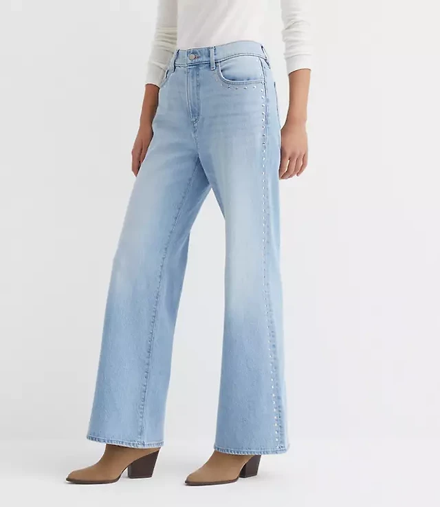 Petite Curvy Studded High Rise Wide Leg Jeans Mid Vintage Wash