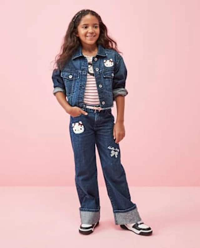 Girls Hello Kitty® Embroidered Roll Cuff Wide Leg Jeans