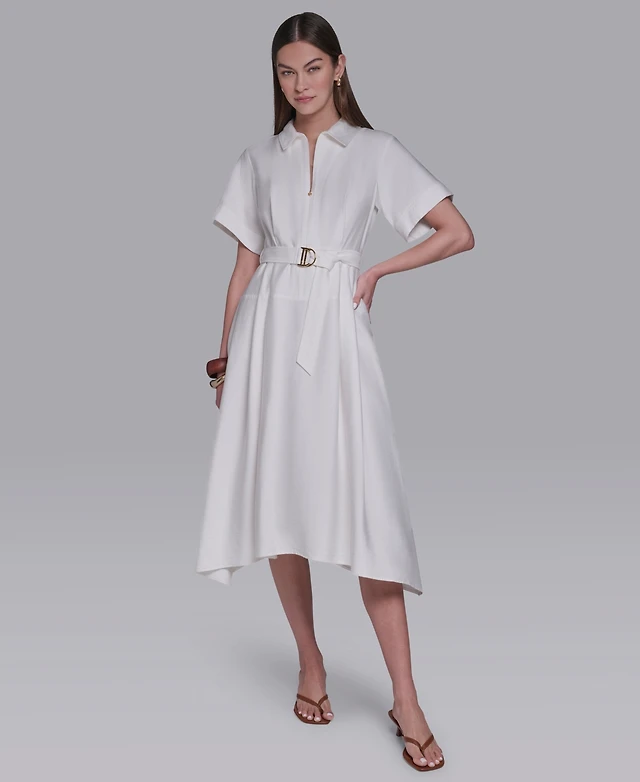 Mac Duggal Women's Puff Sleeve Boucle Midi Dress With Beaded Belt