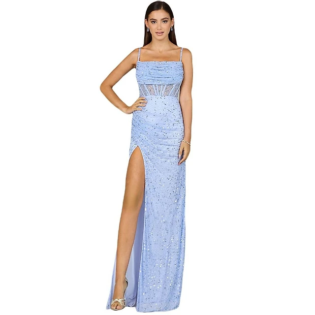 Emerald Sundae Juniors' Glitter Gown with High Slit and X Back