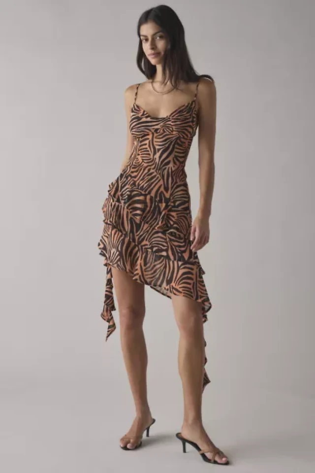 Vintage Y2k Brown & White Printed Ruffled Silk Mini Dress