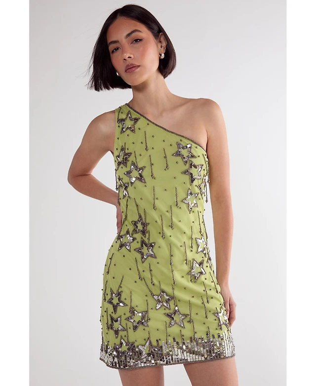 La Moda Clothing Women's Multicolor Mini Dress with Side Asymmetrical Hem and Beaded Neckline