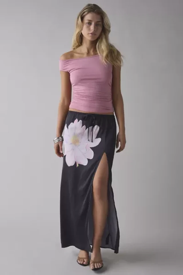 Avec Les Filles Asymmetric Rosette Ruched Maxi Skirt