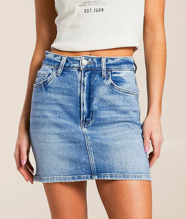 High Waisted Dark Wash Patch Pocket Mini Denim Skirt
