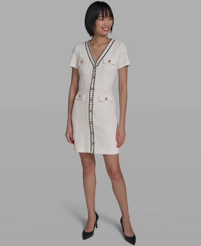Karl Lagerfeld Paris Womens Printed Square Neck Tweed Sheath Dress Printed Open Front Jacket Dress