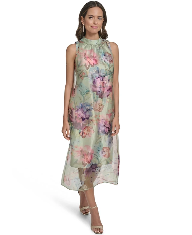 Vince Camuto Women's Printed Organza Overlay Mock Neck Midi Dress