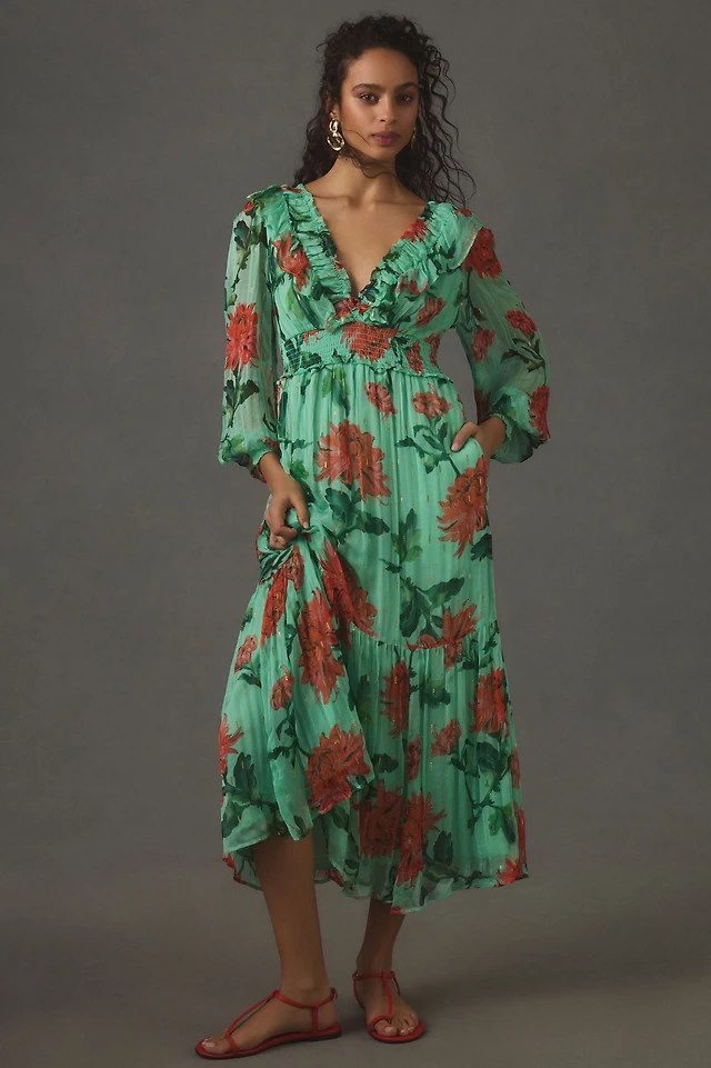 FLOWY RUFFLED V-NECK MIDI DRESS