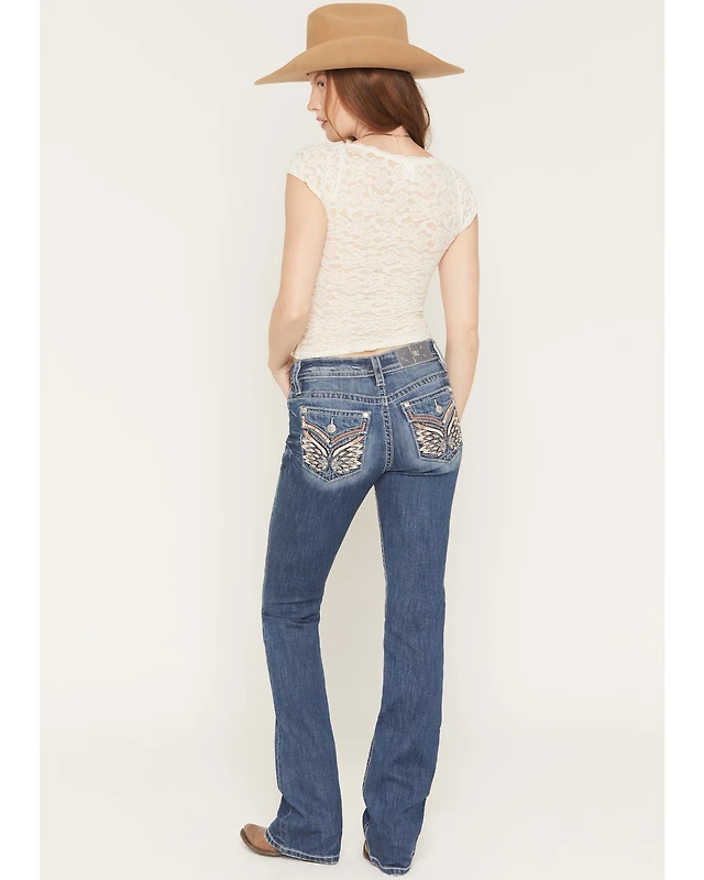 Miss Me Women's Medium Wash Mid Rise Wing Pocket 30" Bootcut Stretch Denim Jeans