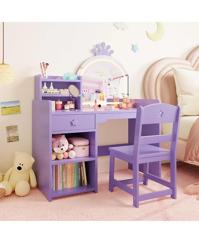 Gymax Kids Vanity Princess Makeup Dressing Table Chair Set W/ Tri-folding Mirror