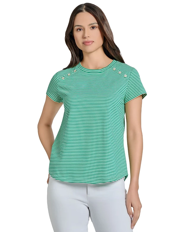 Lauren Ralph Petite Striped Jersey Snap-Trim Boatneck Top