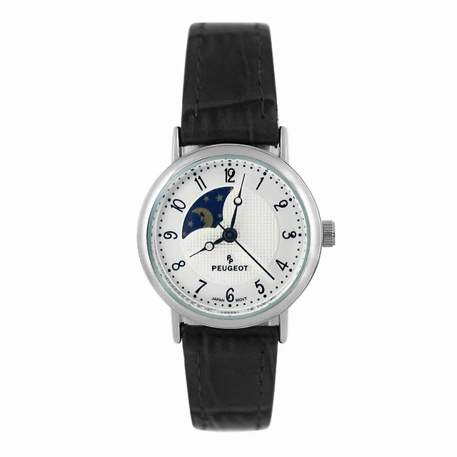 Peugeot Women's 26mm Sun-Moon Phase Silver Watch with Black Leather Strap