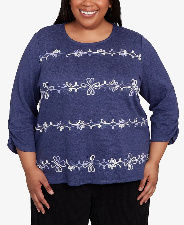 Alfred Dunner Women's Lake Champlain Embroidered Scroll Ruched Sleeve Top