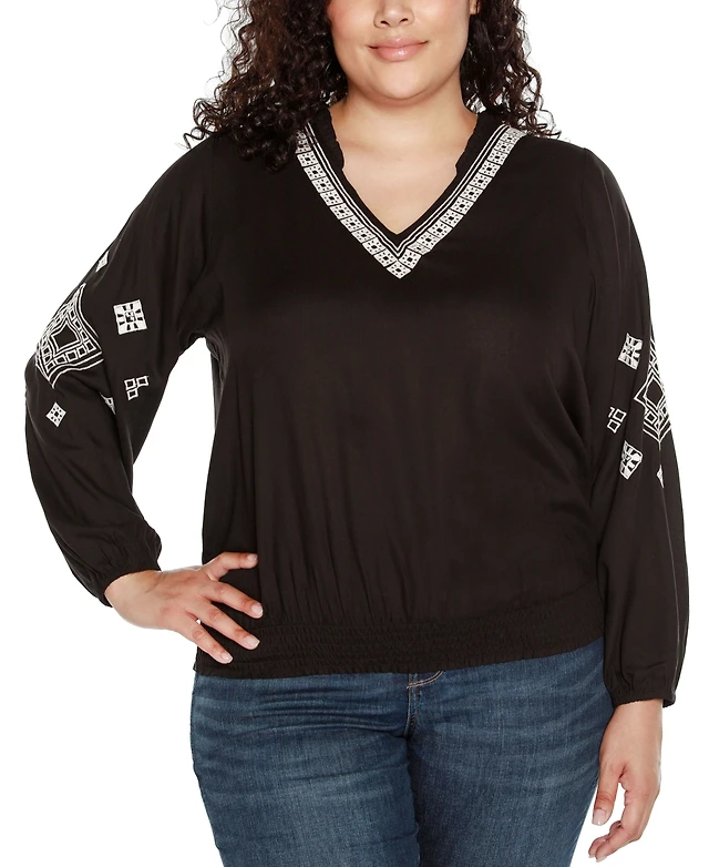 Democracy Plus Size Embroidered Knot Detail Long-Sleeve Top