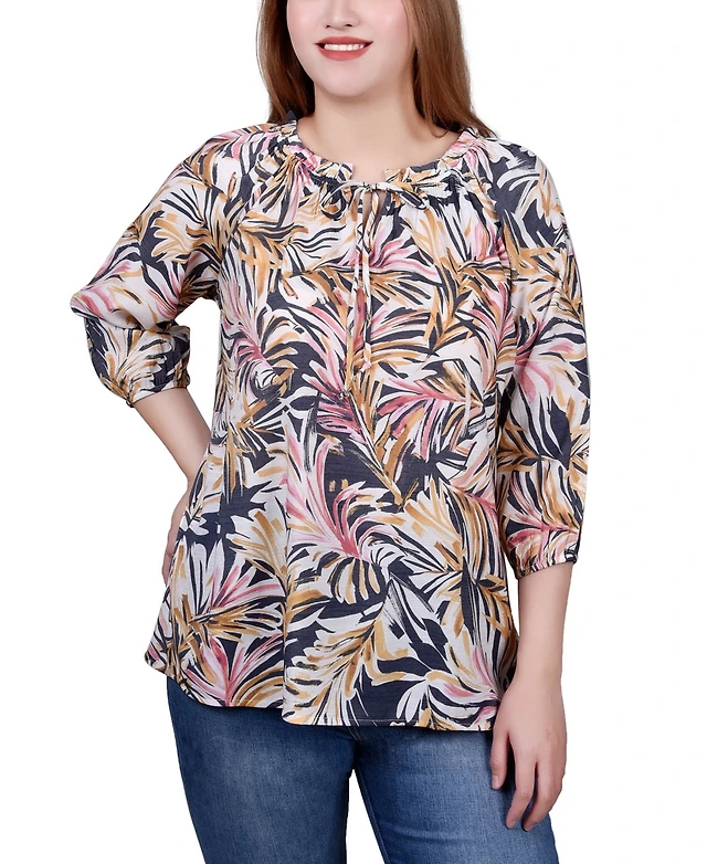 White Mark Plus Pleated Long Sleeve Floral Print Blouse