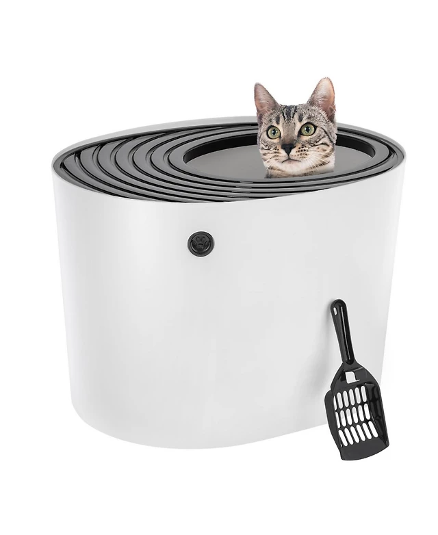 Iris Usa Large Stylish Round Top Entry Cat Litter Box with Scoop, Curved Kitty Litter Pan with Litter Particle Catching, Navy/White