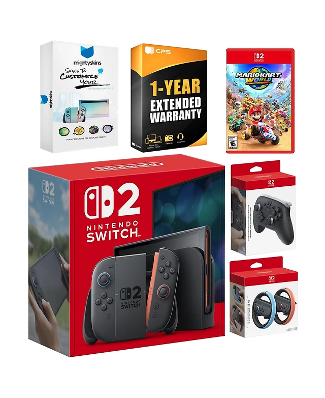 Nintendo Switch 2 Console with Mario Kart World, Pro Controller, Joy Con Wheel and MightySkins Code Bundle