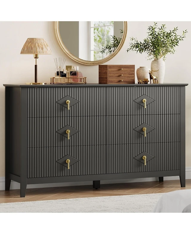 gaomon "47" wide modern 6 drawer fluted dresser with metal handles—wood chest for bedroom or living room."